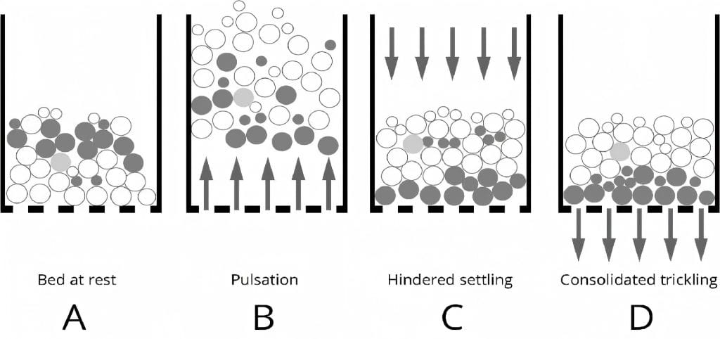 A jig separator operates by subjecting a particle bed to periodic vertical pulsation of water, inducing alternating expansion and compaction of the bed. During this dynamic process, particles stratify primarily according to density and, to a lesser extent, size and shape: